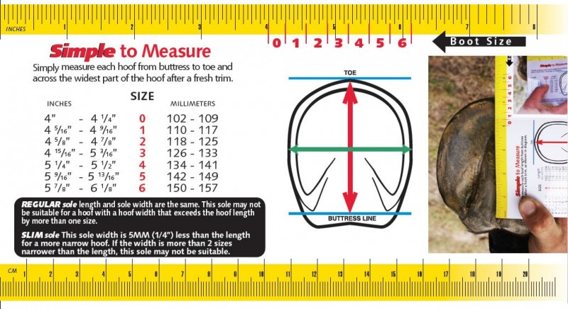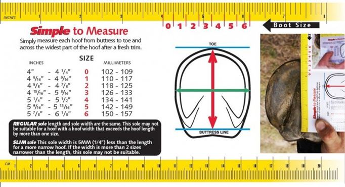 Hoof boots (unless otherwise stated in the description) are intended for barefoot horses doing ridden work. They should be sized and fitted within 7 days of a trim suitable for a working barefoot horse (or at a time when there is nothing at all to trim, and there is still a good rolled edge). The size charts are a good guide to sizing, but this cannot take in to account of the angle of the hoof, heel height and other features of the hooves which will ultimately also effect the fit of the boots.
