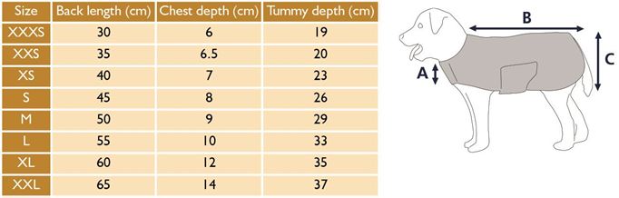 Cosy fold back collar, touch close chest fastening and belly flap, elastic hind leg straps.