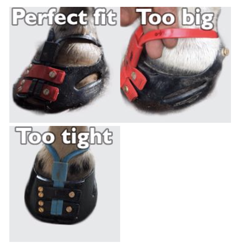 Important Note - The chart is a guide only. For example, if your horse is a heavy breed with big boned hooves/pasterns or has feathers you may need a size larger than the chart from Scoot suggests. Once fitted, ensure you can run a finger under the strap around the periphery of the pastern. If this is not possible you will have to go up a size. If you can easily run two fingers around the periphery then you may have a size too big.