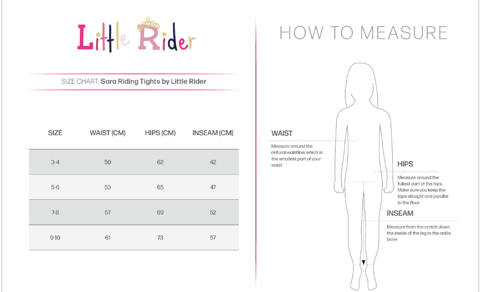 Sara Riding Tights By Little Rider are finished with non bulk stretch hem ankles to allow for comfort under boots or long socks, handy pocket to the left leg to keep possessions safe and Little Rider emblem to complete the look.