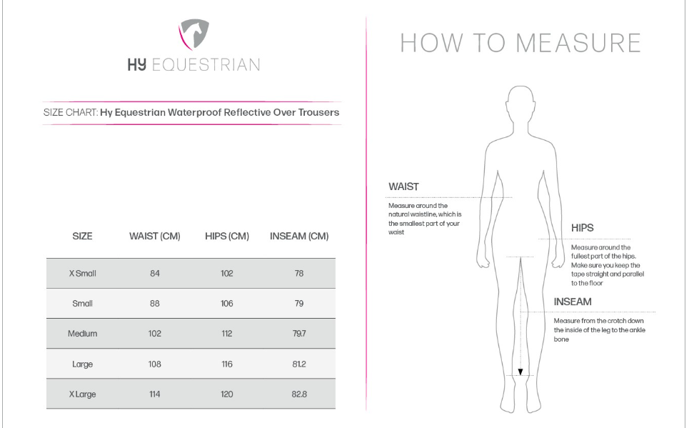 The long side YKK zips ensure you can easily take the Hy Equestrian Waterproof Reflective Over Trousers on and off, even when wearing riding boots. Reflective detailing on the lower leg at the front and rear is ideally placed for reflecting car headlights.