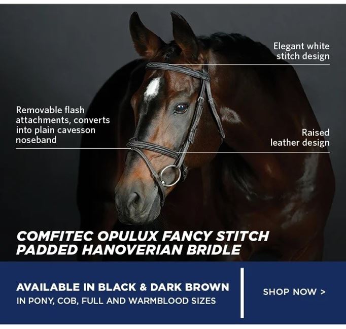 The Collegiate ComFiTec Opulex Fancy Stitch Padded Hanoverian Bridle is expertly crafted from luxurious, super soft leather, providing both elegance and comfort for your horse. Designed to feel like it's been broken in from the first use, this bridle ensures a supple and flexible fit, making it comfortable for long periods of wear.