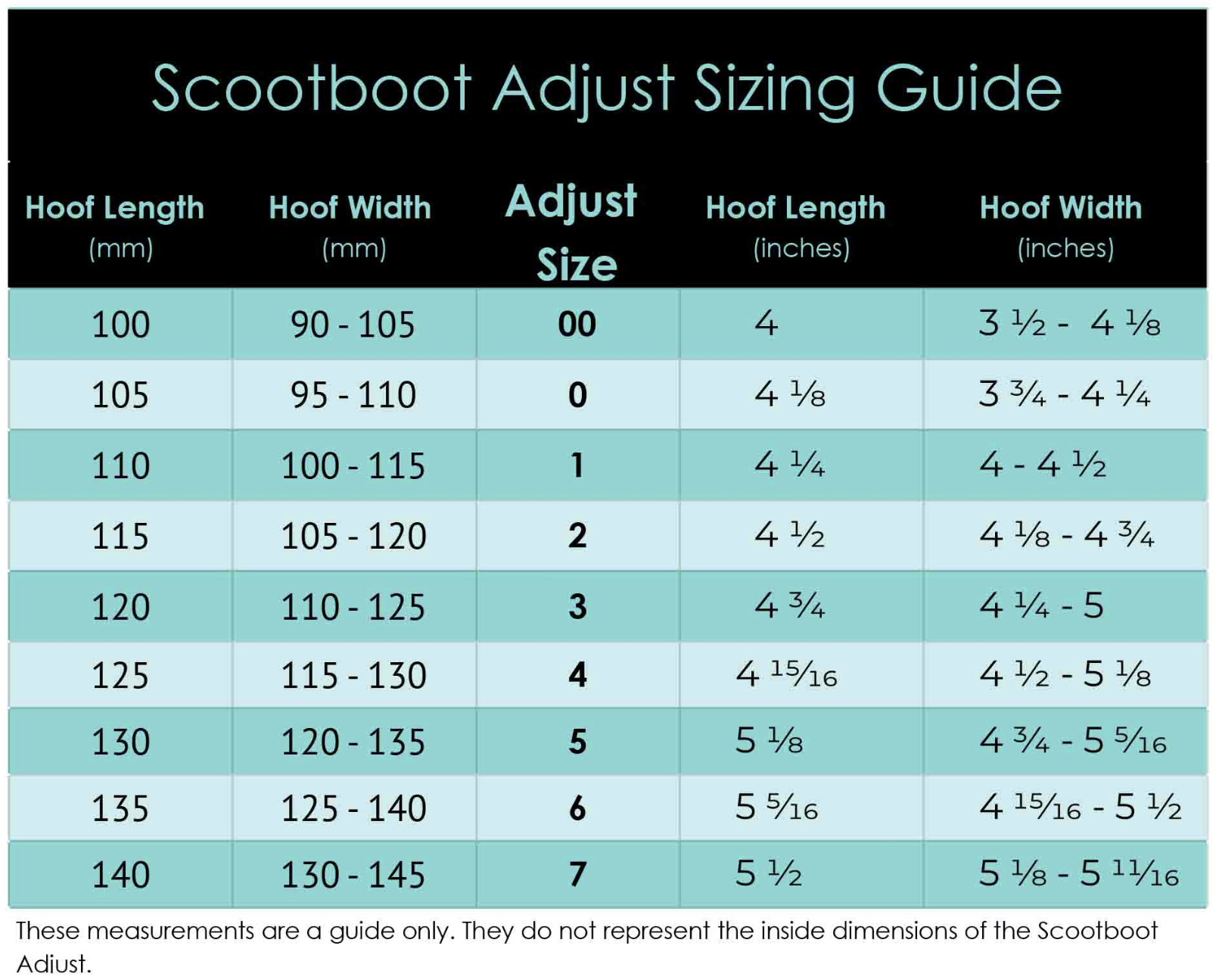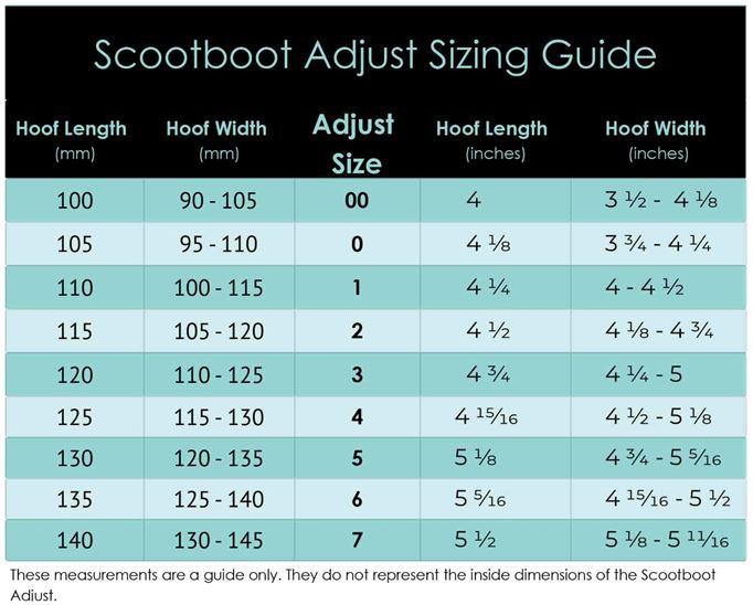 The Adjust (formerly known as the Enduro) is particularly useful for horses that are difficult to fit in original Scoots due to heel height, as the Scoot Boot Adjust will usually fit horses with upright hooves, high heels or under run heels. The Adjust/ Enduro is based on the slim fit Scoot model, so the size chart shows the sizing as slim fit.
