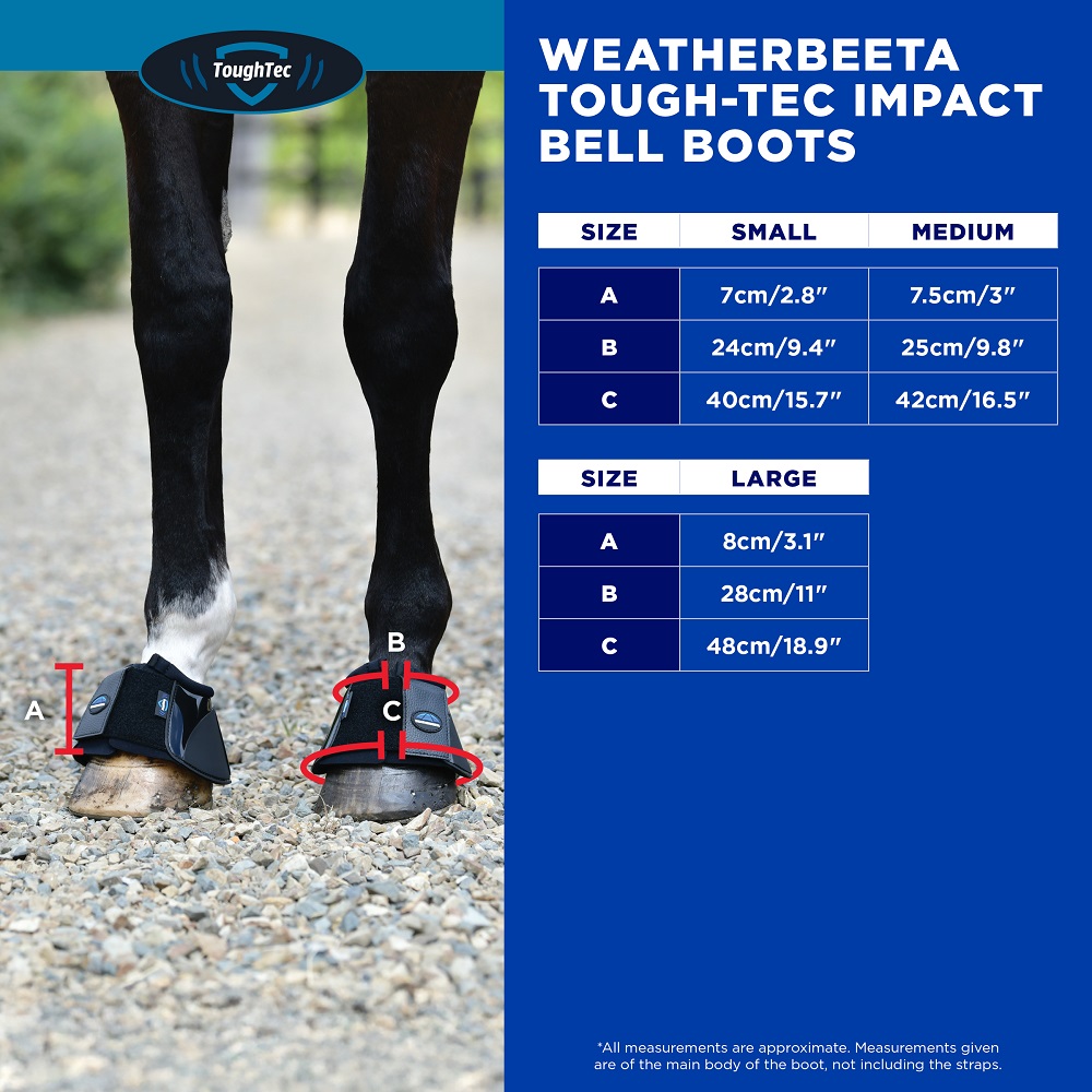 Keep your horse comfortable and protected with the WeatherBeeta Tough-Tec Impact Bell Boots, crafted for all-day wear in any riding discipline. The tough outer layer resists scuffs and knocks, while the soft neoprene interior cushions the hoof area for superior comfort. Their clever non-twist design ensures the boots remain in place, offering reliable protection with every stride. Shaped for a close, anatomical fit, these boots minimise shifting and rubbing, even during active movement. Quick and secure touch tape closures make application effortless, allowing you to spend more time riding and less time adjusting gear.