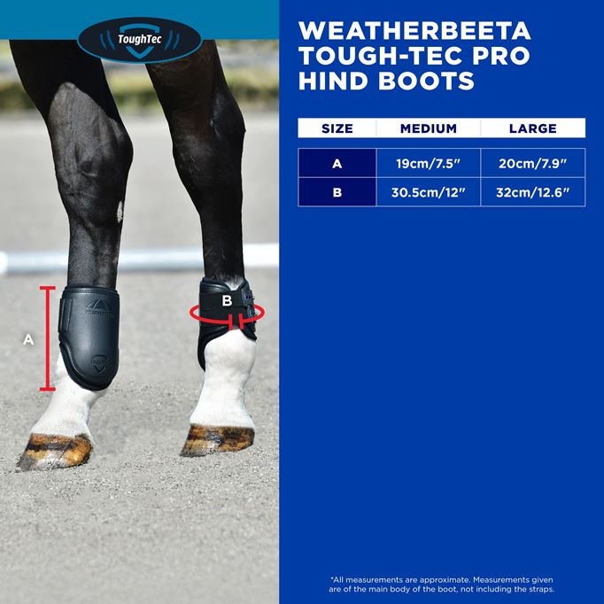Train and compete with confidence in the WeatherBeeta Tough-Tec Pro Hind Boots, expertly engineered for durability and comfort. These high-performance boots are made from robust PU leather to offer reliable protection against knocks and scrapes during exercise. Inside, the breathable perforated neoprene lining enhances ventilation, keeping your horse’s legs dry and well-regulated even under pressure. Elasticated straps ensure the boots stay firmly in place without restricting natural movement, giving your horse the freedom to perform. Easy to maintain and finished with a smart, professional look, they’re ideal for riders who value both performance and style.
