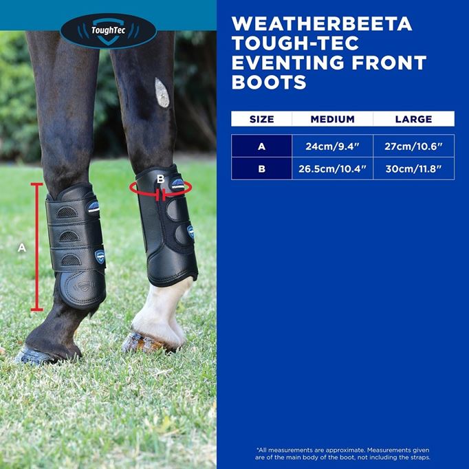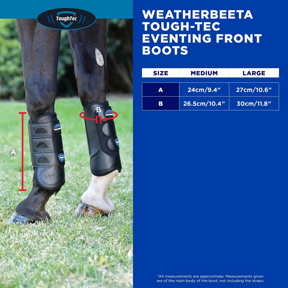 Trust the WeatherBeeta Tough-Tec Eventing Front Boots to keep your horse protected when it matters most. These performance-driven boots feature a fully vented construction that allows air to circulate freely, reducing heat build-up and helping to preserve tendon health during strenuous activity. The robust outer design delivers outstanding protection against the rigours of cross-country courses, while the ultra-soft neoprene interior ensures a smooth, comfortable feel against your horse’s legs. Built to balance flexibility and impact resistance, these boots stay securely in place and move naturally with your horse, offering both safety and freedom. Whether you're galloping through fields or navigating technical combinations, these boots deliver the support your horse needs to excel.