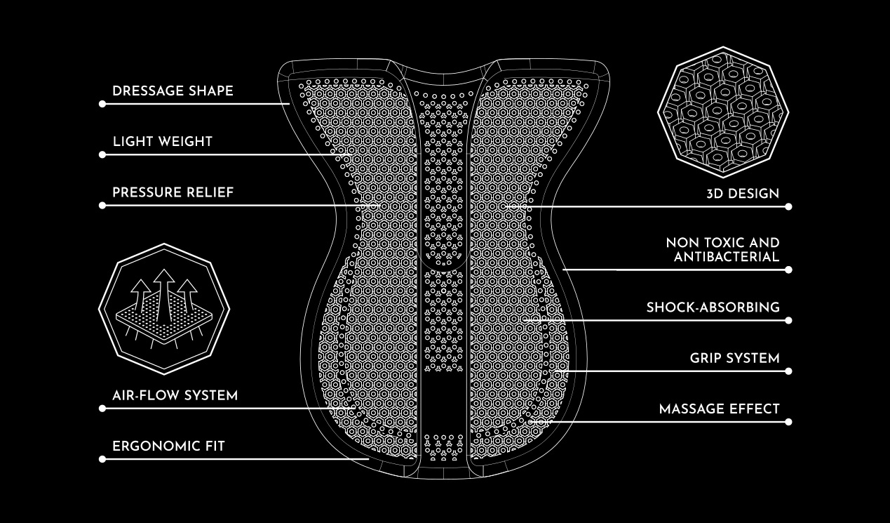 The Front Balance Gel Pad features an anatomical design with a gradual thickness that increases toward the front, making it ideal for providing support to saddles with a low front profile or for raising the area over the withers when needed. Carefully designed to integrate seamlessly with the saddle, it ensures maximum comfort and a perfect fit. Its special hexagonal 3D no-impact structure with separate open cells offers discreet shock absorption, exceptional slip resistance, and excellent support for the withers while effectively absorbing impacts, relieving pressure, and evenly distributing weight. The reduced thickness in the central area allows the pad to conform to the horse’s back and withers, maintaining proper spacing between the saddle and gel for continuous air circulation. Made from non-toxic and hypoallergenic gel, it is safe for direct contact with the horse’s skin, ensuring comfort, protection, and superior performance.